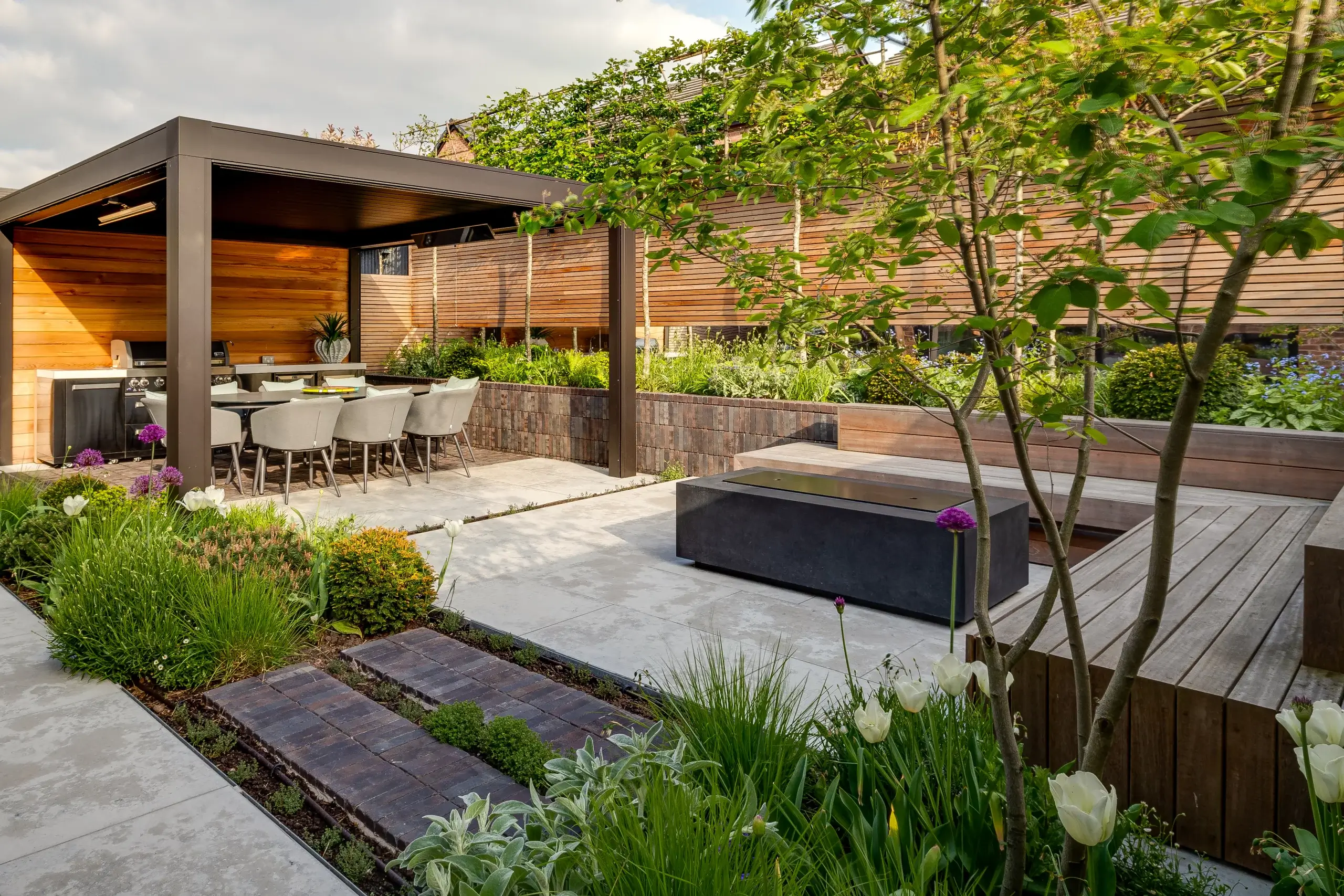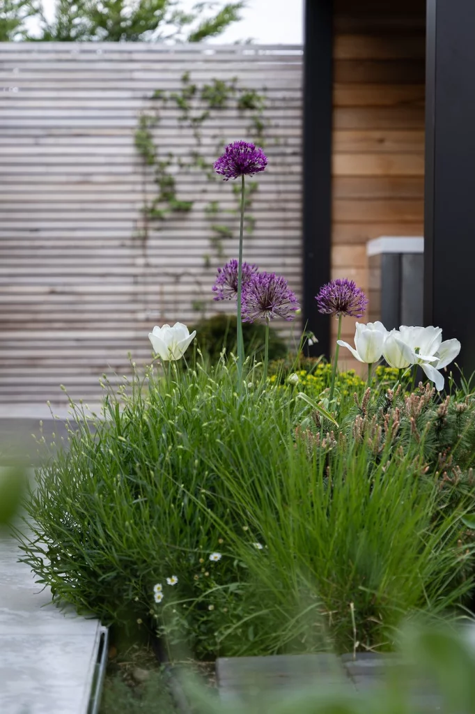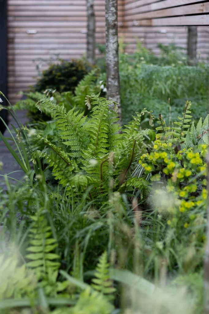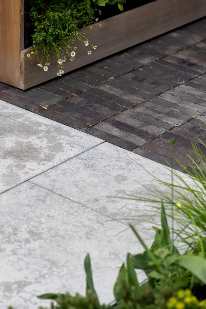 Hard landscaping combined Jura limestone, anthracite clay pavers and western red cedar batten fencing, setting a natural tone that’s softened by rich planting and muted seasonal colour. The planting scheme is layered and immersive, offering interest throughout the year.