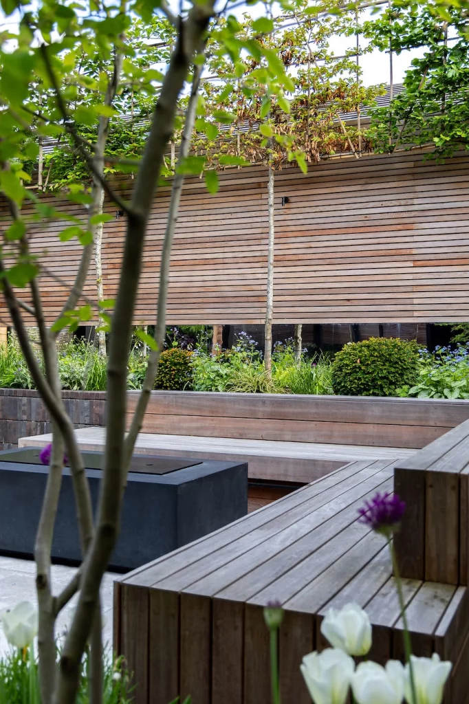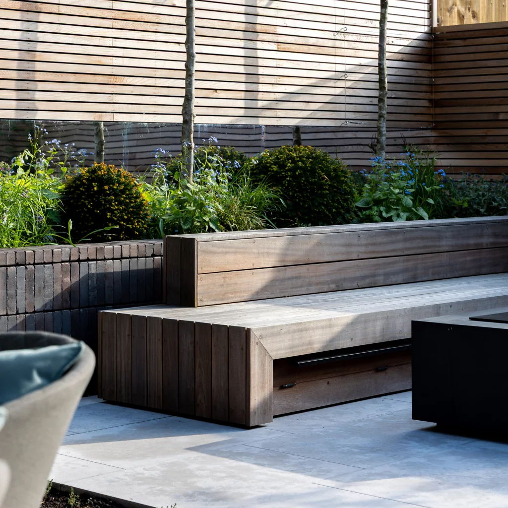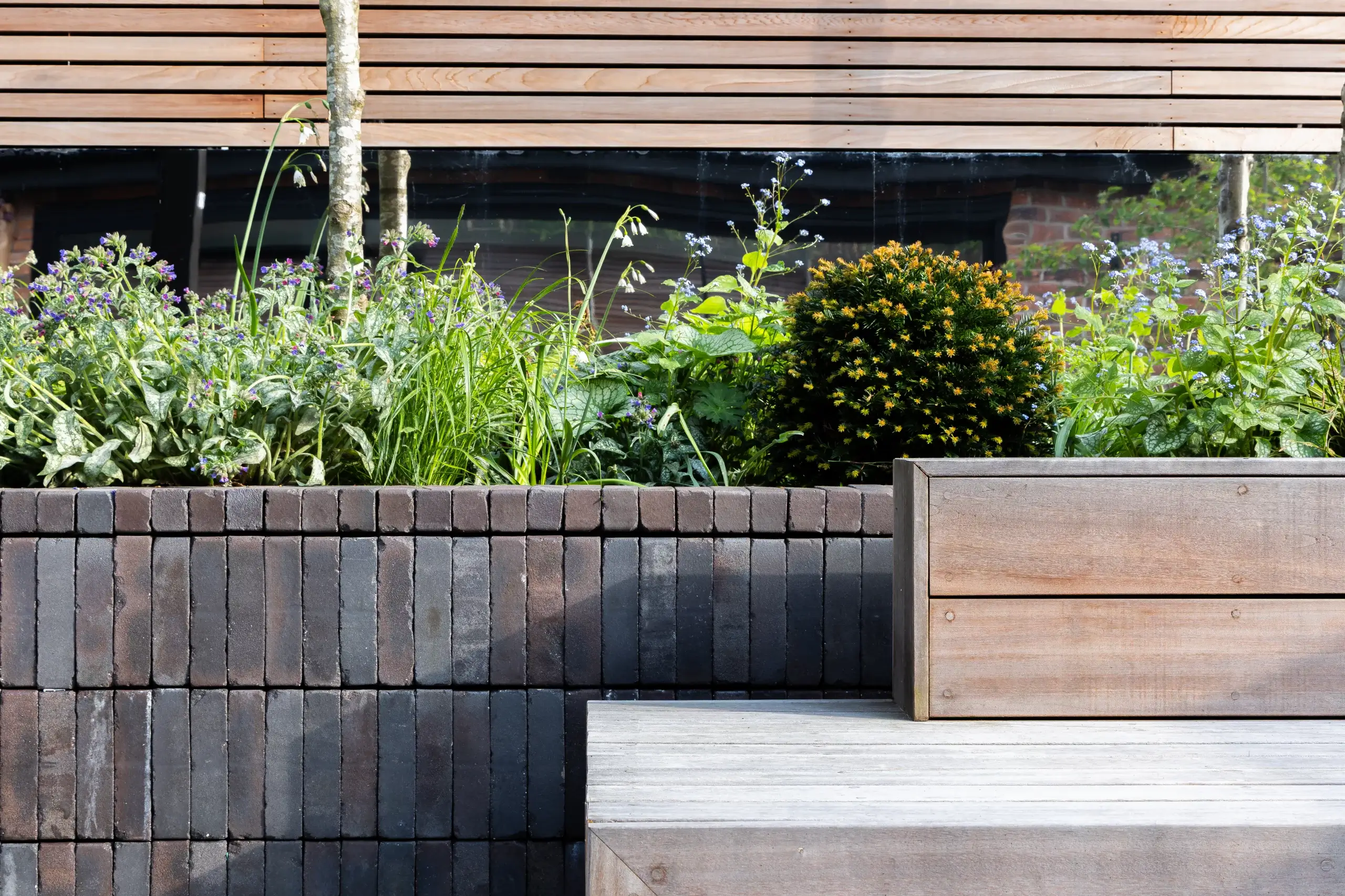 Looking after all the hard landscaping we installed a wraparound calming water feature, commissioned a stunning single cast floating concrete bridge with soft lighting, built a crescent moondeck immersed in the planting, and clad a redbrick outbuilding with charred larch to blend in with the landscape.